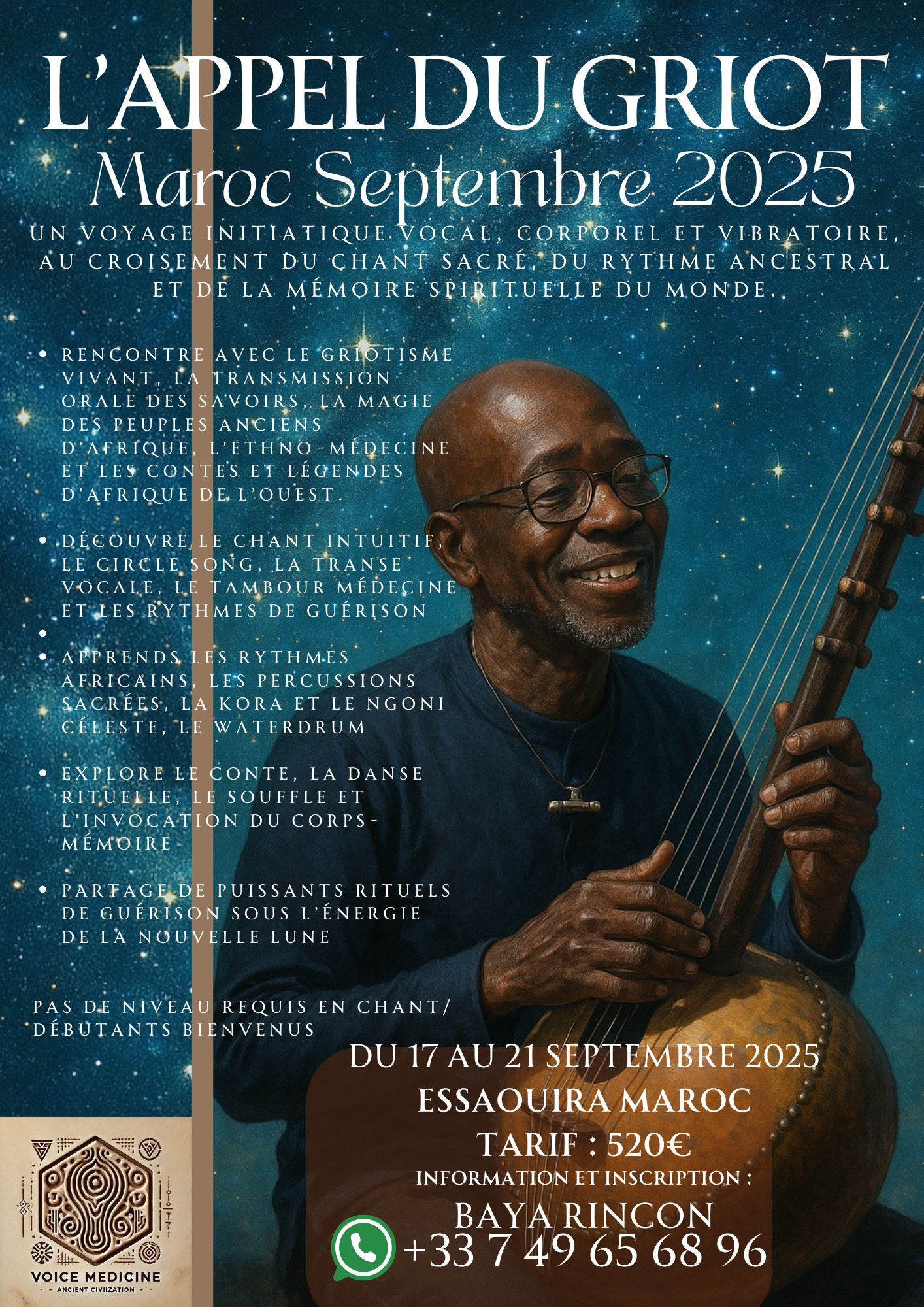 La Voice Medicine ne se limite pas au chant ou à l’expression artistique : c’est une invitation à la transformation personnelle, à la reconnexion avec les mémoires ancestrales, et à la guérison à travers le son. Elle s’adresse à tous, que vous soyez débutant ou professionnel, et ne nécessite aucune expérience préalable en chant.